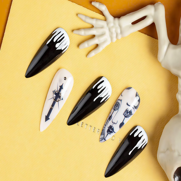 Bộ nail gây ấn tượng với sự đối lập hoàn hảo giữa đen huyền bí và trắng tinh khôi. Họa tiết giọt sơn loang chảy phá cách, cùng hình vẽ khuôn mặt nghệ thuật đầy ma mị khiến bộ nail trở thành điểm nhấn độc lạ.