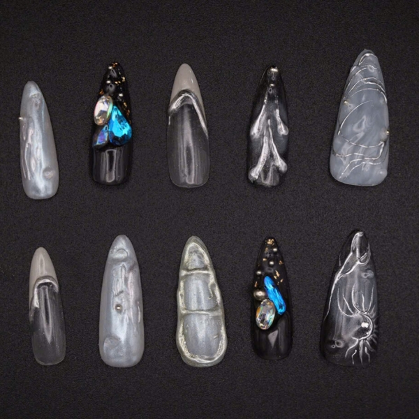 Lấy cảm hứng từ sự bí ẩn của đại dương, “Nail box Báu Vật Đại Dương” mang đến một bộ móng độc đáo với gam màu chủ đạo xám – đen – xanh ngọc ánh kim, điểm xuyết pha lê và hiệu ứng vẽ tay 3D. Mỗi chiếc móng giống như một mảnh báu vật được nhặt từ biển sâu, vừa sang trọng vừa cuốn hút.