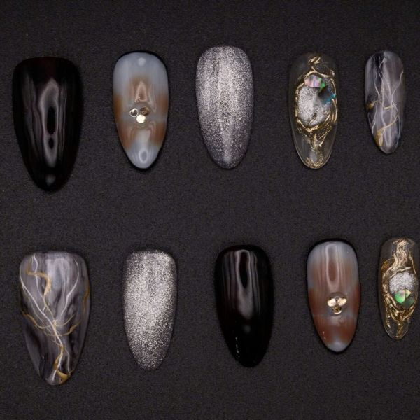 Bộ nail nổi bật với sắc đen – xám – bạc làm chủ đạo, kết hợp ánh nhũ lấp lánh và đường vân vàng mô phỏng mạch khoáng tự nhiên. Một số móng được nhấn nhá bằng họa tiết ánh ngọc 3D, tạo cảm giác như viên khoáng thạch phát sáng trong bóng tối.