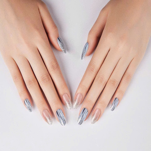 Tựa như những con sóng bạc lăn tăn dưới ánh trăng, “Nail box Gợn Sóng Bạc” mang đến gam màu xanh biển – bạc ánh nhũ, vừa bí ẩn vừa quyến rũ. Bộ móng là sự kết hợp hoàn hảo giữa sự mềm mại của đại dương và nét sang trọng của kim loại, giúp đôi tay bạn nổi bật trong mọi ánh nhìn.