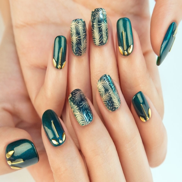 Bộ nail này mang sắc xanh rêu trầm ấm làm nền, nổi bật với hoa văn lá vàng ánh kim tinh xảo – gợi cảm giác như một khu rừng mùa thu được dát vàng, vừa bí ẩn vừa quý phái.